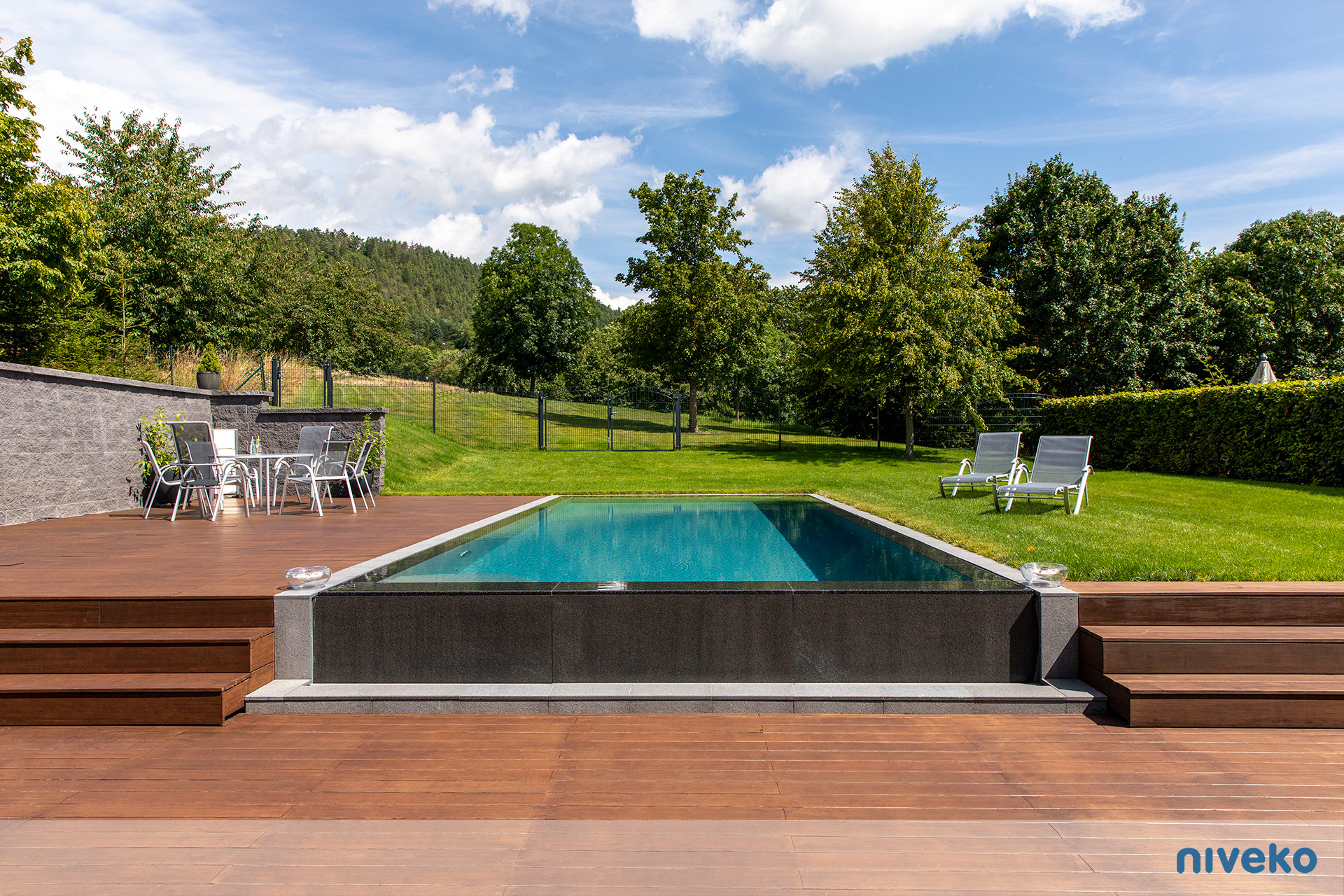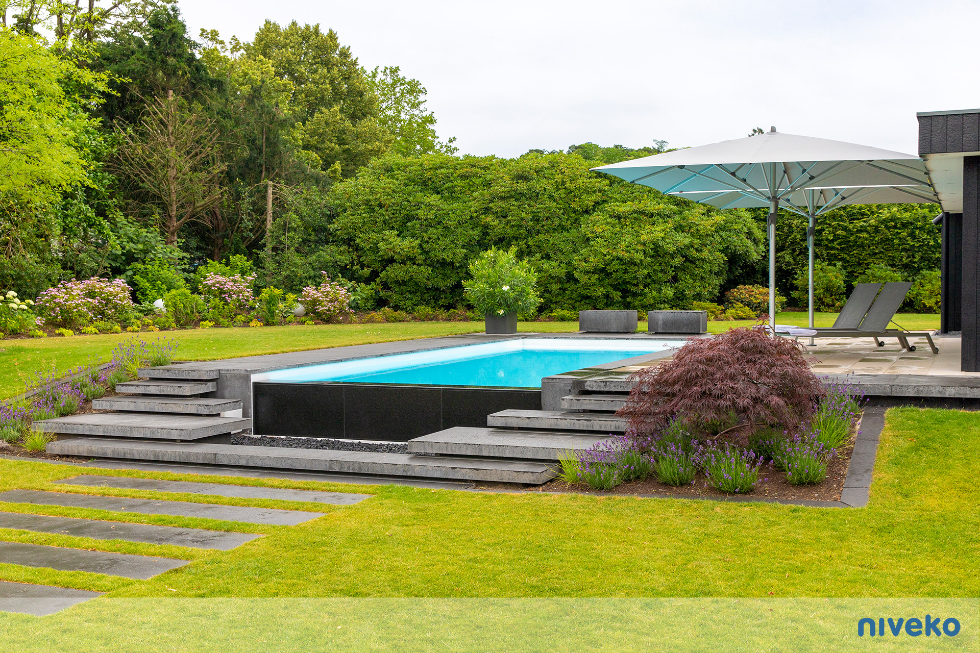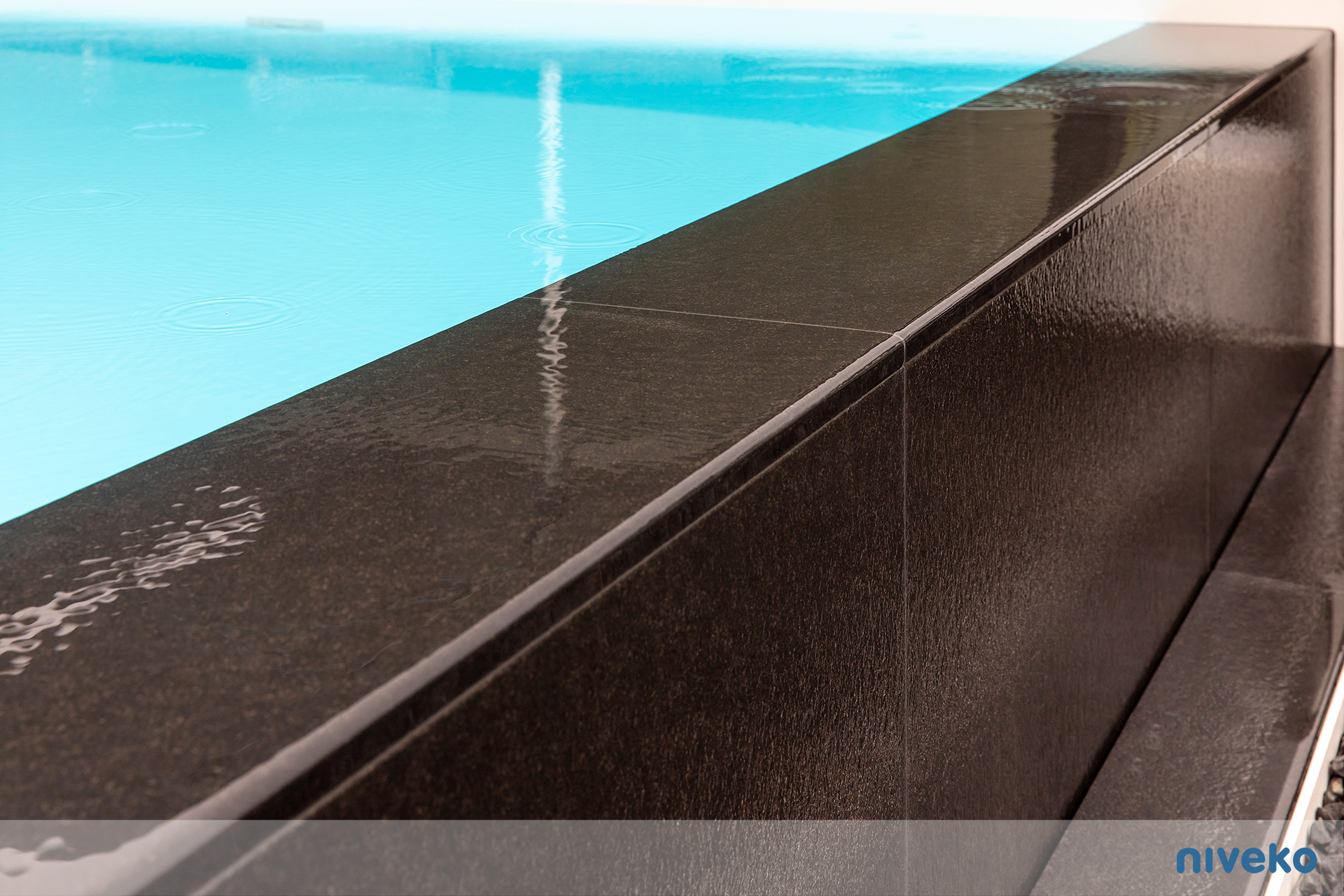 Niveko Overflow Infinity är en overflowpool i exclusive segmentet. En Infinity kan du få i vilken storlek eller form du vill och med en överringgsränna i ett antal olika varianter av sten. Våra Advance pooler är något alldeles extra! Denna exklusiva pool är för dig som vill ha det bästa, senaste och vackraste man kan få när det gäller pool! Vår Infinity pool passar speciellt bra på sutterrängtomter eller på tomter med en vacker utsikt över hav eller sjö. Man kan välja vilken sida man vill ha Overflow-kanten på för att passa tomten bäst. Modellen finns även i en Whisper-variant för en tystare upplevelse. Den är kompatibel med alla våra pooltäckningar, men vi rekommenderar särskilt pooltak eller Nivekos integrerade lamellskydd.