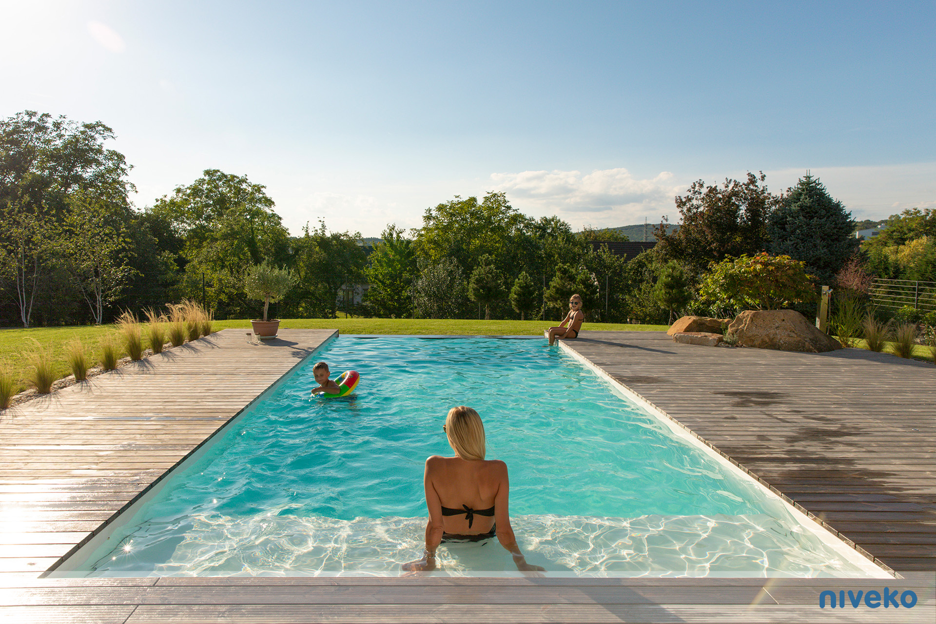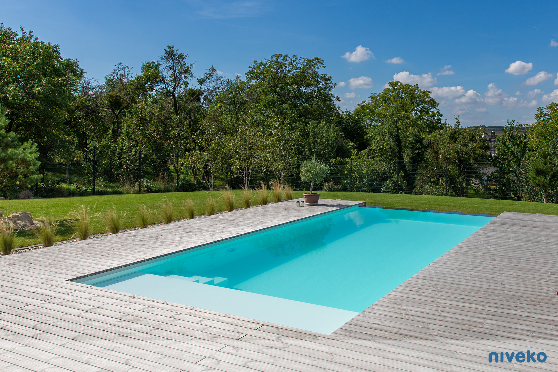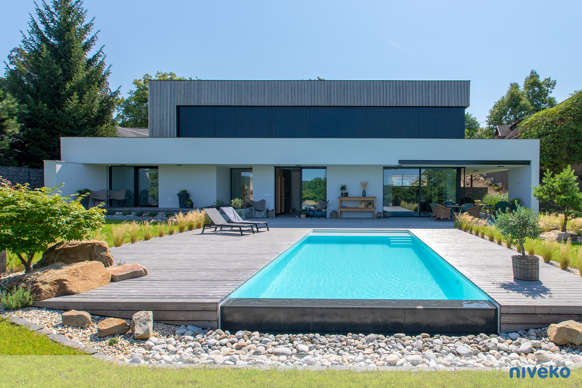 Niveko Overflow Infinity är en overflowpool i exclusive segmentet. En Infinity kan du få i vilken storlek eller form du vill och med en överringgsränna i ett antal olika varianter av sten. Våra Advance pooler är något alldeles extra! Denna exklusiva pool är för dig som vill ha det bästa, senaste och vackraste man kan få när det gäller pool! Vår Infinity pool passar speciellt bra på sutterrängtomter eller på tomter med en vacker utsikt över hav eller sjö. Man kan välja vilken sida man vill ha Overflow-kanten på för att passa tomten bäst. Modellen finns även i en Whisper-variant för en tystare upplevelse. Den är kompatibel med alla våra pooltäckningar, men vi rekommenderar särskilt pooltak eller Nivekos integrerade lamellskydd.