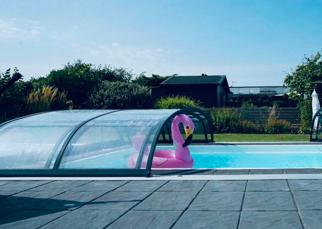Nova Comfort – vår exklusiva standardserie för pooltak med normal takhöjd. Med antracitgrå profiler, 3 mm klarplast och elegant design passar det alla standardpooler, med eller utan poolsarg. Taket erbjuder gott om simutrymme och är barnsäkert med låsbar funktion. Utrustat med skjutdörr på valfri sida, avtagbar front- och bakgavel samt extra platta komfortskenor (12 mm). Förlängningsskenor möjliggör att taket skjuts förbi poolen. Automatisk sektionslåsning med nyckel. 3 års materialgaranti.